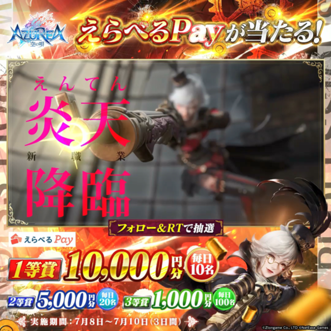 『AZUREA-空の唄-』では、新職業「炎天」の実装を記念して、7月8日(金)から7月10日(日)にかけて、公式Twitterにて毎日抽選で10名様に最高金額1万円が当たるキャンペーンを開催いたします。公式アカウントをフォローし、リンクをクリックするとその場で結果がわかります。詳細は、公式Twitter情報をご参照ください。
