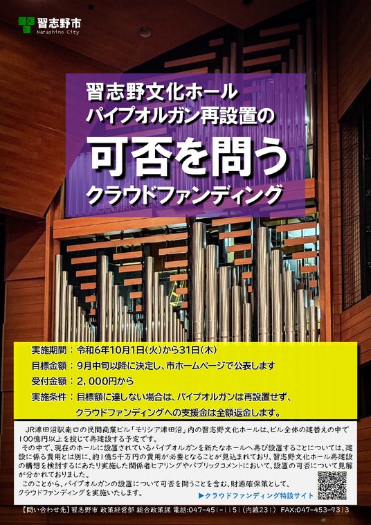 習志野文化ホール建替えに伴う、パイプオルガン再設置に関するクラウドファンディングを、令和6年10月1日から実施します。