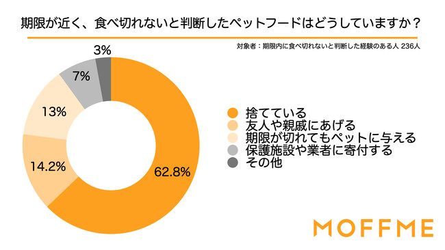 まだ期限は切れていないが、期限内に食べ切れないと判断したペットフードをどうしているのかを確認したところなんと捨てていると回答した人が62.8%を占めました。