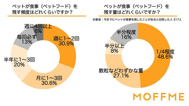 さらにペットが食事を残す量を聞いたところ、最も多い回答が「1/4程度」で48.6%を占めていることがわかりました。