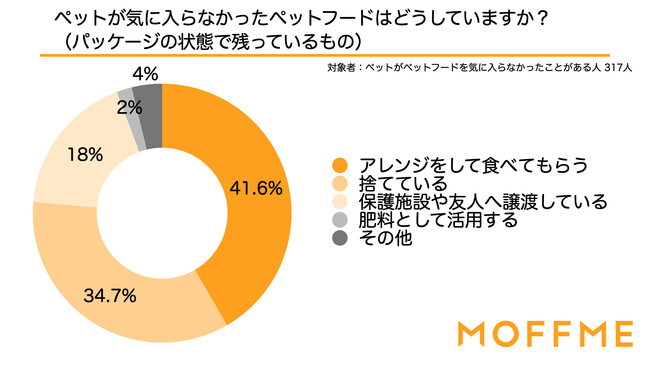 「アレンジをして食べてもらう」が41.6%、「保護施設や友人へ譲渡している」が18%、「肥料として再利用している」が2%とフードが無駄にならないように工夫している人が大半を占める中、34.7%もの人は「捨てている」と回答しました。