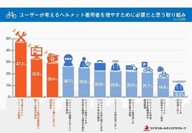 ・ユーザーが考える「ヘルメット着用者を増やすために必要だと思うこと」は、「持ち運びやすいヘルメットの開発」(47.3%)が1位、次いで「ヘルメット着用の重要性に関する報道の増加」(32.8%)、「ヘルメット購入に対する補助制度」(29.4%)となった。