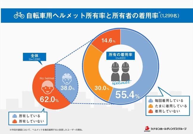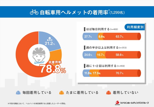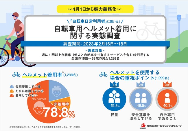 エネルギー・住まい・暮らしの総合サービス事業を提供するシナネンホールディングス株式会社(本社:東京都港区、代表取締役社長:山崎 正毅、以下 シナネンホールディングス)と、その子会社で、自転車の製造・卸売及び自転車専門店「ダイシャリン」を展開するシナネンサイクル株式会社(本社:東京都港区、代表取締役社長:中西 信昭、以下 シナネンサイクル)および、シェアサイクル「ダイチャリ」を運営するシナネンモビリティPLUS株式会社(本社:東京都港区、代表取締役社長:三橋 美和、以下 モビリティPLUS)は、4月1日より自転車用ヘルメットの着用が努力義務化となることを踏まえ、日常的に自転車を利用する全国の約1,300人を対象に「自転車用ヘルメット着用に関する実態調査」を実施しましたので、調査結果をお知らせします。