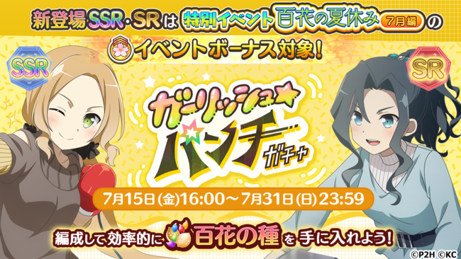 新登場の青属性『SSR チャーミングハプニング 犬吠埼風』(CV:内山 夕実) と赤属性『SR ハイレベルレーサー 弥勒蓮華』(CV:伊藤 美来) は「特別イベント 百花の夏休み 7月編」のイベントボーナス対象!