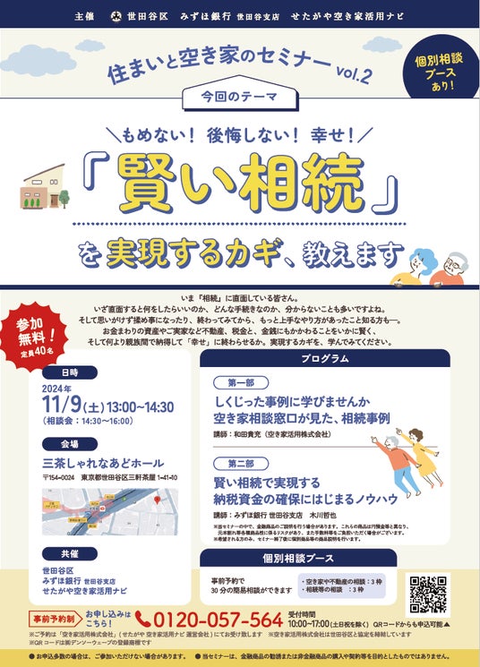 11/9(土)13:00~14:30 三茶しゃれなあどホール。事前参加申し込み制、参加無料。個別の相談ができる簡易相談ブースも無料で予約可能。空き家にならないための対処を学んでみて