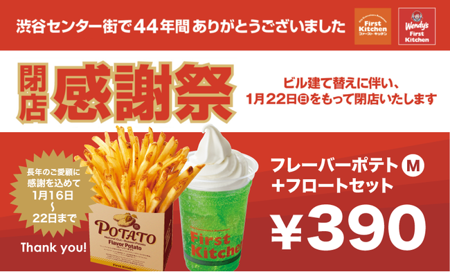 渋谷センター街店は、1978年5月3日にファーストキッ チンの3号店としてオープンし、多くのお客様にご愛顧いただきました。2016年12月からはウェンディーズ・ファーストキッチンとして展開してまいりましたが、この度、ビルの建て替えに伴い44年の歴史に幕をおろします。 渋谷センター街店では、22日までの期間に「閉店感謝祭」を実施しています。フレーバーポテトMサイズとフロートをセットにして、Thank you!価格=390円でご提供いたします。営業最終日となる22日までの間に多くの皆様のご来店をお待ちしております。 また、今後の店舗展開については、ビル建て替え後の再入居なども含めて検討中です。