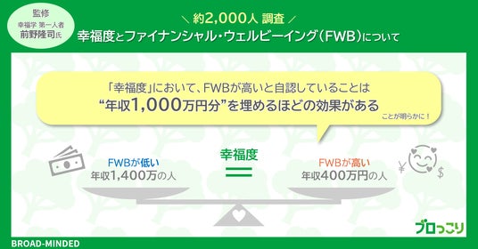 ライフプランの実現を支援する金融サービス開発カンパニー ブロードマインド株式会社は、幸福学第一人者であり、日本初「ウェルビーイング学部」学部長に就任した前野隆司教授をお招きし、【従業員幸福度を高める、まったく新しい“切り口”を学ぶセミナー】を5月29日に開催しました。そのセミナーにて発表した「幸福度とファイナンシャル・ウェルビーイング(以下、FWB)の関係性」に関する調査結果の全文やセミナーアーカイブについて公開いたします。なお、当該調査結果につきましては前野教授に監修いただいております。