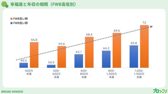 【FWBが高い 年収400万円の人】と【FWBが低い 年収1,400万の人】の幸福度は同等であることが明らかになった。