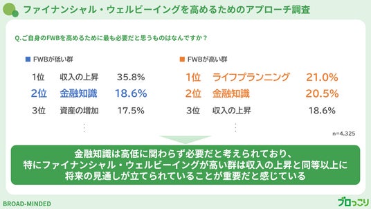 一方でFWBが高い人においては、「ライフプランニング(見通しを立てる)」が21%で最多、次に僅差で「金融知識」(20.5%)、次いで「収入の上昇」(18.6%)という結果となった。