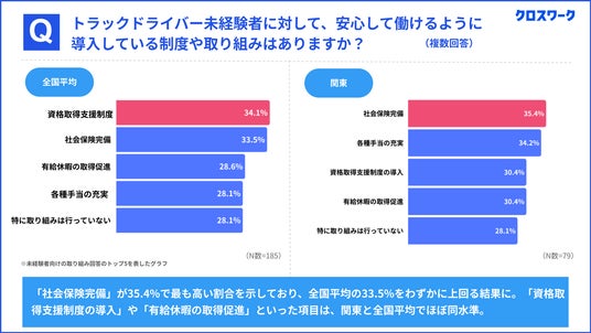 一方、関東地方の未経験者向けの支援として「社会保険完備」が35.4%で最も高い割合を示しており、全国平均の33.5%をわずかに上回っています。また、「運転手当や安全運転手当など各種手当の充実」も関東が全国平均より高い割合です。