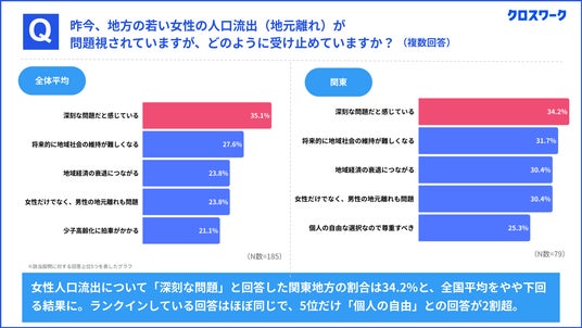 関東地方では、地方の女性人口流出に対して「深刻な問題だと感じている」が34.2%と、全国平均の35.1%とほぼ同水準の認識を持っていることが明らかになりました。