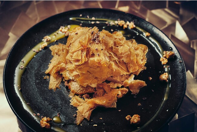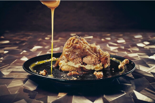 商品詳細:コーヒーシロップをたっぷり浸したビスキュイの上に、濃厚なマスカルポーネクリーム、チョコレートのシュトロイゼルやジャンドゥーヤジェラートを重ね、仕上げにフワフワ食感のエスプレッソのかき氷をトッピング。ティラミスをそのまま冷たいかき氷としてお楽しみいただける味わいです。また、かき氷のまわりにはキャラメリゼしたヘーゼルナッツや、かつて「禁断の酒」とも言われたハーブ酒「アブサン」で香り付けしたマンゴーオレンジソースをあしらい、プレミアムな大人のかき氷に仕上げました。