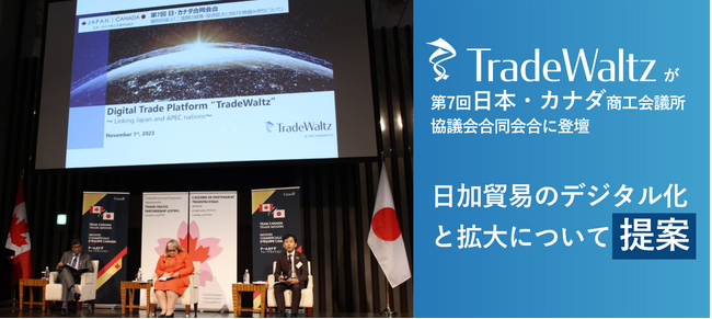 貿易情報連携プラットフォーム「TradeWaltz(R)︎」を運営する株式会社トレードワルツ(以下:トレードワルツ)は、2023年11月1日、都内で開催された第7回日本・カナダ商工会議所協議会合同会合の、個別討議2.「二国間の貿易・投資拡大に向けた枠組み作りについて」に登壇し、TradeWaltzを活用した日加貿易のデジタル化と拡大について提案を致しました。