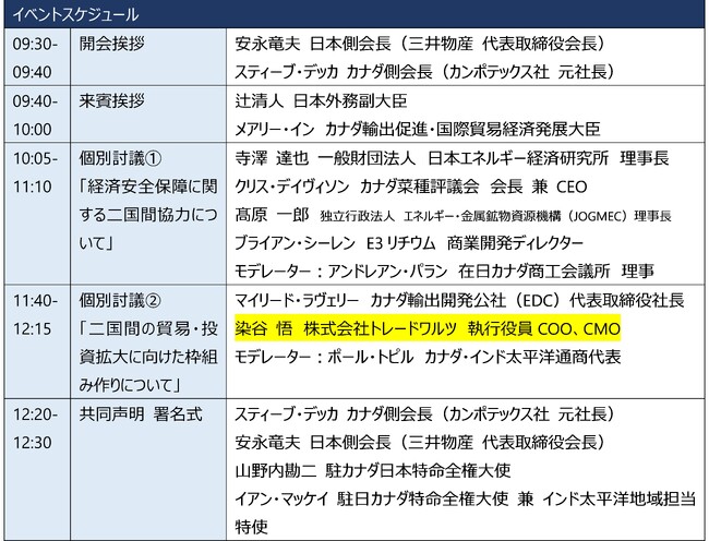 「日本とカナダの更なる経済関係深化・発展のため、両国の中小企業によるビジネス参入が期待されるところ、今回トレードワルツ様から発表・提案頂いた内容は非常に時宜を得たものであり、両国の関係者に大きな一石を投じるものになったと思います。今後、スキーム構築のためのフォローアップが肝要になりましょうが、今回討議された内容が具体的な成果に結び付き、両国間の貿易促進に寄与することを心より祈念いたします。」