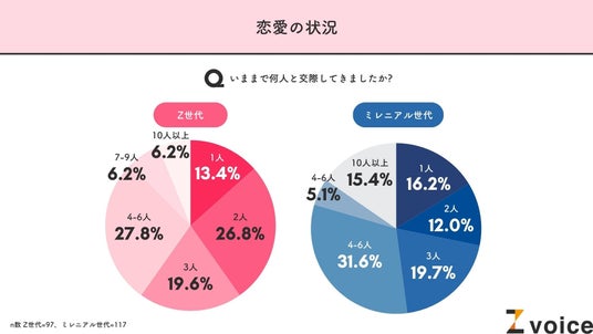 一方のミレニアル世代は過半数が4人以上との交際経験があり、「10人以上」と答えた割合も、Z世代の2倍以上となる15.4%でした。