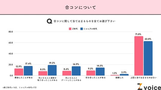 また、合コンに関する経験のうち当てはまる項目を聞いたところ、ミレニアル世代では参加したことがあるのが17.4%で、さらに交際に至った人が14.5%との回答に。