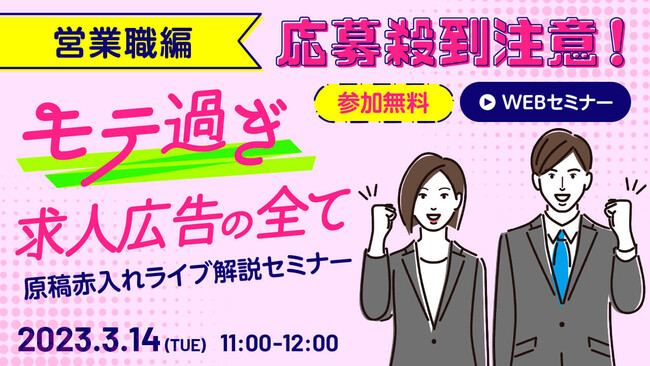 企業のオウンドメディアリクルーティングを支援する株式会社天職市場(本社:東京都新宿区西新宿、代表取締役:春名 敬太)は、2023年3月14日(火)に社員採用担当者向けオンラインセミナー『応募殺到注意!モテ過ぎ求人広告の全て-原稿赤入れライブ解説セミナー-』を開催いたします。