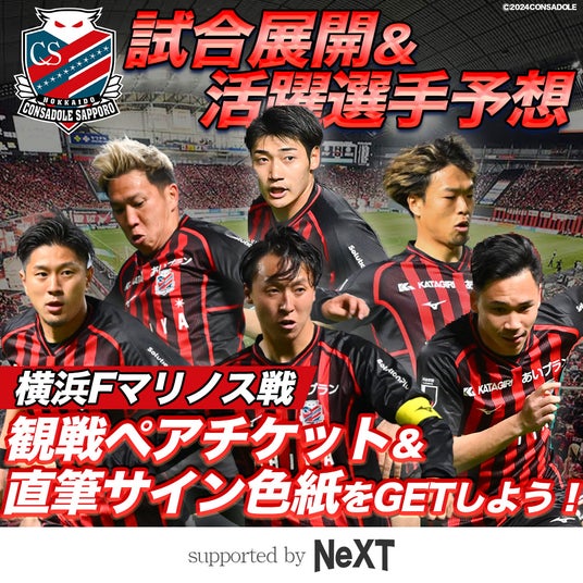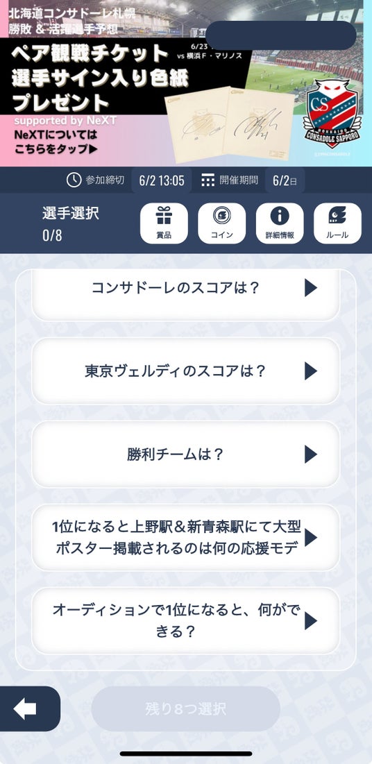 東京ヴェルディ戦の試合展開や活躍選手の予想と、株式会社NeXTが提供するクイズに回答し、その成績で1位~2位となった2名様には6月23日(日)北海道コンサドーレ札幌vs横浜F・マリノスのペア観戦チケットを、3位~7位となった5名様に、北海道コンサドーレ札幌の選手サイン色紙をプレゼントします。