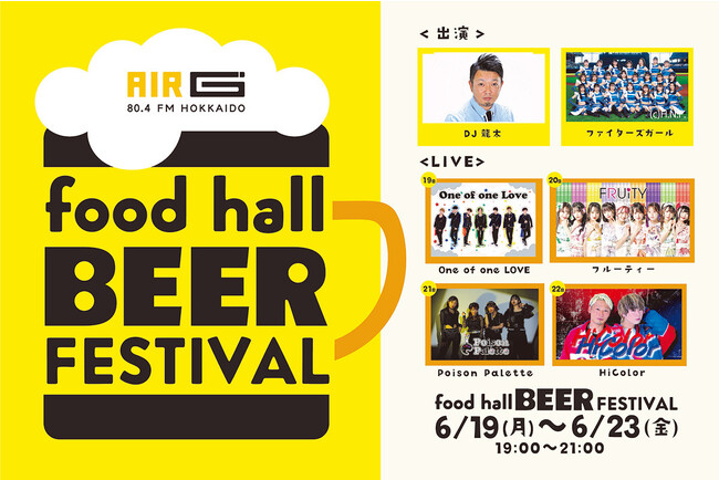 エスコンフィールドHOKKAIDOでは6月19日(月)~23日(金)の5日間、tower eleven foodhall by Nipponhamで「AIR-G’ foodhall BEER FESTIVAL」を開催いたします。かつて札幌大通ビアガーデン会場で大人気だった「STREET RADIO80.4」が約15年ぶりに復活。フードホールのテーブルに設置した楽曲リクエストメニューから、お客様にお好きな曲をリクエストしていただき、音楽とビールを思う存分楽しんでいただけます。イベント期間中の6月19日(月)~22日(木)は、LIVE PRO所属のアーティストによるミニライブを開催いたします。入場無料でお楽しみいただけますので、お気軽にお立ち寄りください。