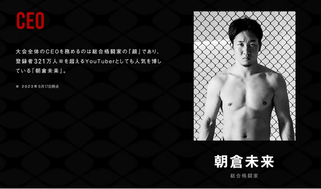 登録者数325万人超え(2023年10月02日時点)の人気YouTuberでもある総合格闘家の朝倉未来がCEOを務め、スペシャルアドバイザーとして総合格闘家の朝倉海、総合格闘家の白川陸斗が参画しています。