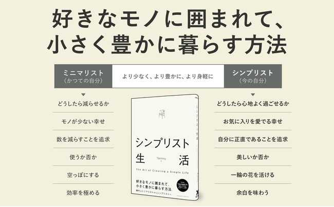 株式会社クロスメディア・パブリッシング(所在地:東京都渋谷区千駄ヶ谷、代表取締役:小早川幸一郎)は、3月18日、『シンプリスト生活』を発刊いたします。本書は、YouTubeライフスタイル分野で人気チャンネル「Tokyo Simple Life」を運営するTommy氏が、「シンプリスト」と呼ばれる「好きなモノに囲まれて、小さく豊かに暮らす」新しいライフスタイルを提案します。