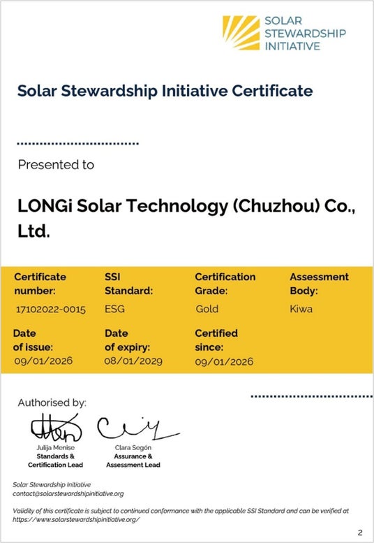 LONGi(ロンジ、LONGi Green Energy Technology Co., Ltd./本社:中国・西安市)は1月、滁州工場および嘉興工場において、SSI(ソーラー・スチュワードシップ・イニシアチブ)のESG基準に基づく審査を通過し、認証を取得しました。