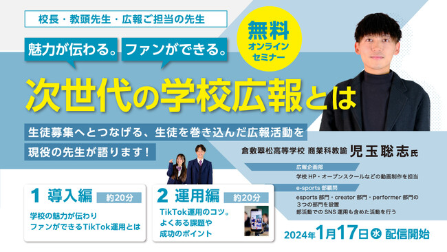 子どもたちと学校を取り巻くさまざまな社会課題を解決するスクールソリューションカンパニーの菅公学生服株式会社 (本社:岡山市北区駅元町、代表取締役社長:尾崎 茂 以下:カンコー学生服)が運営する学校現場の課題や子どもたちの未来を先生方と共に考えるサイト「Teacher with」は1月17日(水)に教職員向け無料動画セミナー「魅力が伝わる。ファンができる。次世代の学校広報とは」を公開いたします。