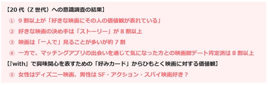 今回は意識調査の実施に合わせ、興味や関心事といった自身の価値観を簡単に表現できる『with』の「好みカード」の傾向を調べました。映画カテゴリーに登録されている好みカードのうち、男性に比べ女性による登録が多い好みカードの特徴として、「リトル・マーメイド」「美女と野獣」「ラプンツェル」といったディズニー映画に関する内容が多いことが分かりました。ディズニー映画の愛らしい世界観とハッピーエンドなストーリーが女性の心をつかむようです。逆に、女性に比べ男性による登録が多い好みカードは、「SF映画」「アクション映画」「スパイ映画」といった映画ジャンルに関するもので、映画を通じてスリルや興奮を楽しみたいといった心境が表れていそうです。