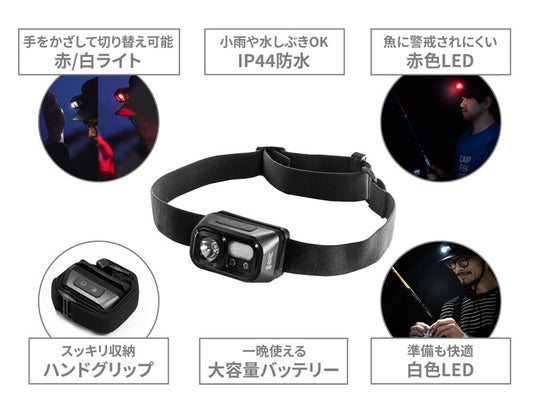 以前よりたくさんのご要望をいただいているヘッドライトがついに登場。釣りシリーズとしての展開ですが、キャンプや天体観測でも赤白切り替えが活躍します。手をかざすだけのシンプル操作が手がふさがりがちな釣りやキャンプで大重宝です。