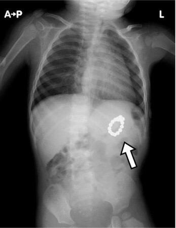 マグネットセットは強い磁力により離れた位置にあっても引きつけ合うため、胃や腸といった消化管壁越しに引き合い、壁を挟んで引っ付いて自然排出されなくなります。それによって挟まれた消化管壁の血流が滞り、壊死することで消化管壁に穿孔(穴があくこと)が生じるおそれ等があります。