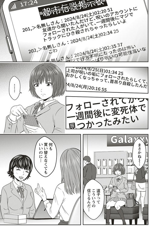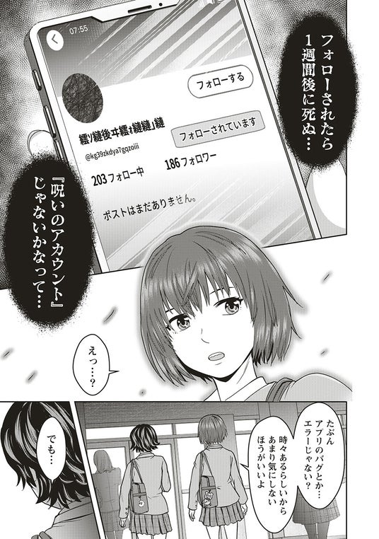 高校2年の水戸春香は、友人の森口道子から「呪いのアカウント」にフォローされてしまったと相談を受ける。そしてフォローされてから1週間後、道子は春香の目の前で急に電車に飛び込み、謎の死を遂げる…!