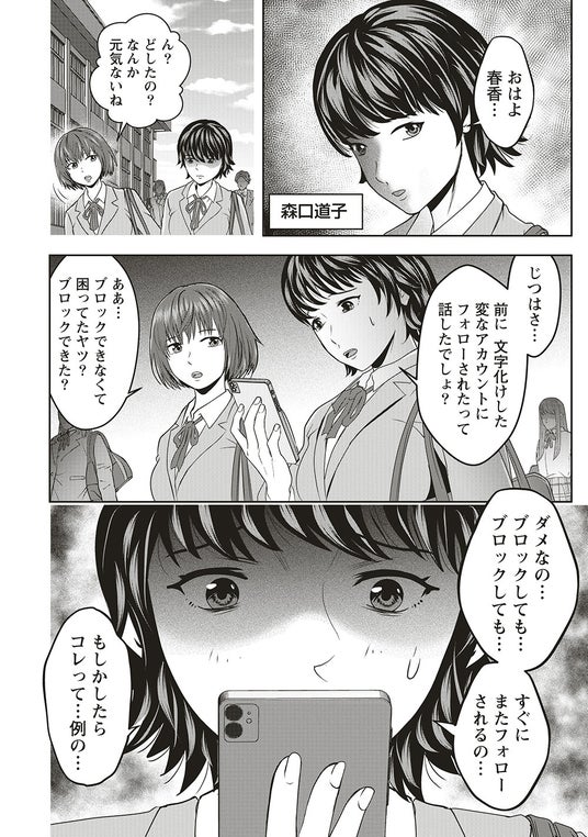 直後に春香も呪いのアカウントからフォローされ、さらにクラスメイト芦屋世津奈の企みによってそれはクラス中に拡散され、春香の周りで次々と死の連鎖と呪いの怨念が広がっていく――。
