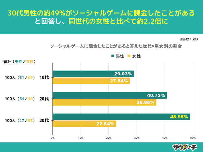 【30代男性の約49%がソーシャルゲームに課金したことがあると回答し、同世代の女性と比べて約2.2倍に】