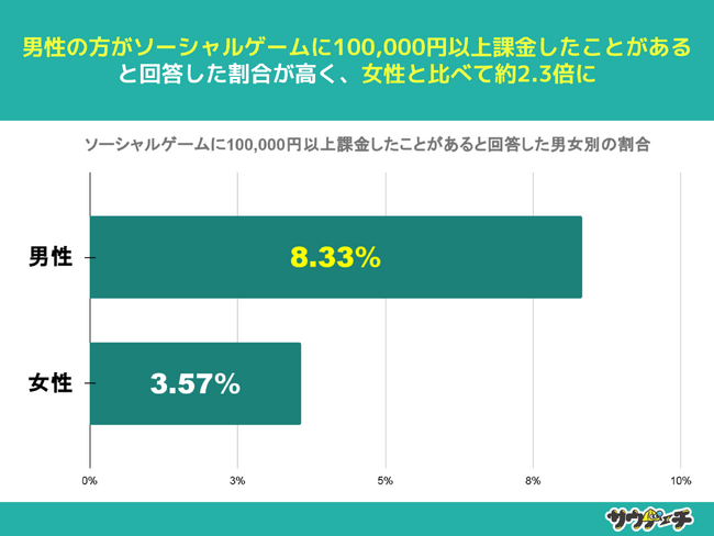 ソーシャルゲームに100,000円以上課金したことがあると回答した割合を男女別でみてみますと、男性が約8%、女性が4%で、女性と比べて男性は約2.3倍高い結果となりました。