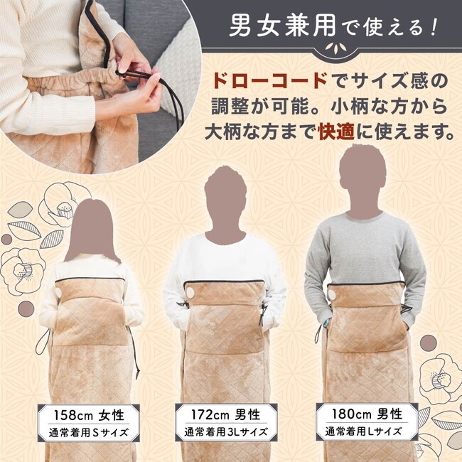 消し忘れ防止に役立つオフタイマー(30分/60分/120分/240分)機能付。足底の部分は開いて足を出せるようになっており、そのまま歩くことが可能。表裏ともにフリース素材で360度全身温かさを閉じ込めます。汚れたら洗濯可能。いつでも清潔に保てます。男女兼用でウエストサイズは80cm~140cmに対応。左右のドローコードで様々なサイズの方でも調整して快適にお使いいただけます。消費電力は55Wで一般来なこたつ(300W)と比べても約1/5の電気代でお得に使えます。使わないときはコンパクトに収納でき場所もほとんど取りません。