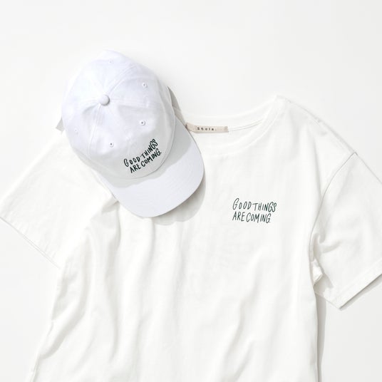 Tシャツと同じメッセージをあしらったキャップも展開。オフにはグリーン、ブラックにはオフで刺繍を施しました。細字のテキストメッセージを活かしたシンプルなデザインは、都会的で洗練されたイメージ。カジュアルスタイルだけでなく、エレガントな着こなしの外しとして取り入れるのもおすすめです。