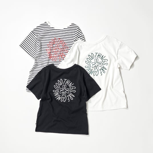 「Good Things Are Coming(良いことは向こうからやってくる)」というポジティブなメッセージをタイポグラフィーとイラストで表現。フロントの左胸には2行のメッセージをプリント、背面には同じメッセージをサークルロゴであしらいながらクローバーモチーフを囲っています。クローバーモチーフはGood Thingsというワードから着想し、ハートのような形の葉を持つ四つ葉のデザインに。