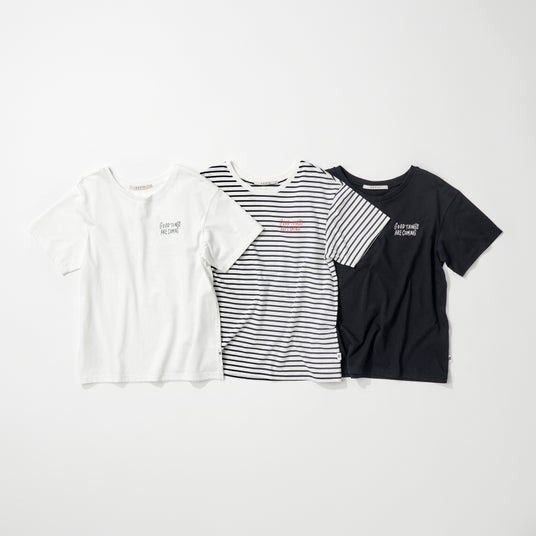 商品詳細:コットン100%、M/ユニセックスの2サイズ展開、価格:無地¥7,480、ボーダー¥8,580