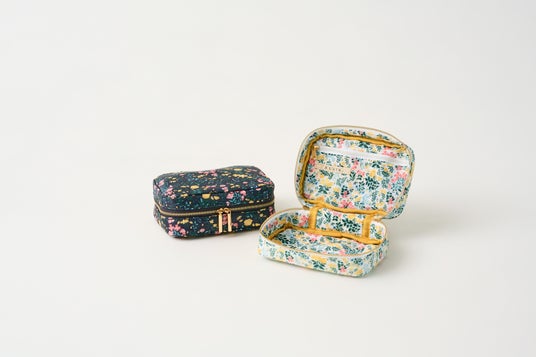 スカーフと同じ柄をあしらった花柄ポーチ。パイピングは花柄の色にそれぞれ合わせ、デイリーなメイクポーチやトラベル用にも使える大中小の3サイズを用意。オフ系・ネイビー系の2色展開。