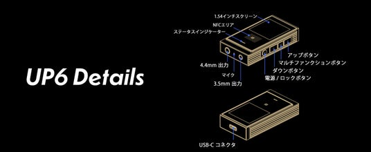 UP6は、有線イヤホンや有線ヘッドホンを製品本体に接続することで、ES9069Q DACチップによる美しい高解像度サウンドを無線環境で手軽にお楽しみ頂けるBluetoothレシーバー機器です。