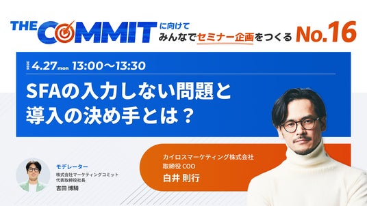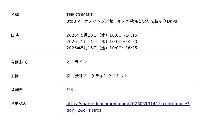 “次の一手”がデータでわかるMA+SFA一体型ツール「Kairos3(カイロススリー)」を提供するカイロスマーケティング株式会社(本社:東京都渋谷区、代表取締役:佐宗 大介、以下「当社」)は、株式会社マーケティングコミットが主催するオンラインカンファレンス「THE COMMIT BtoBマーケティング/セールスの戦略と実行を結ぶ3Days」に、当社取締役 COO 白井 則行が登壇することをお知らせします。