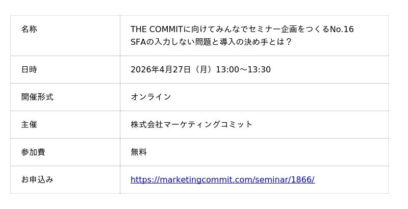 本カンファレンスでは、戦略と実行を結びつけることをテーマに、AI活用、データ分析、ウェビナーやイベントによる商談創出など、実務に直結する内容が幅広く取り上げられます。当社は、「SFAの設計」をテーマに、営業活動の中で蓄積されたデータを、マーケティングでも活用できる仕組みづくりについて解説します。