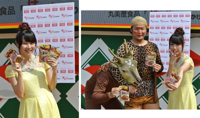 丸美屋食品工業株式会社(本社:東京都杉並区、社長:阿部豊太郎)では、今までありそうでなかった斬新メニュー、いつものドライタイプとはひと味違う、しっかり味のふりかけ「はらぺこふりかけ<えび天味>」、「はらぺこふりかけ<串カツ味>」、「はらぺこふりかけ<お好み焼き味>」を8月6日(木)に新発売いたしました。商品の発売を記念して、8月16日(日)に新商品発表会を開催いたしました。新商品発表会には、9月下旬放送開始予定の新TVCMに出演する高柳明音(SKE48)と共演者として出演するバンビーノが登場、会場を大いに盛り上げました。