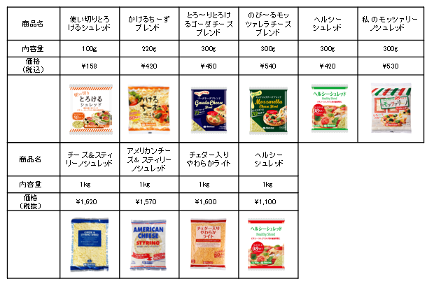 原材料:食用植物油脂(国内製造)、乳たん白、でん粉、食塩、乳等を主要原料とする食品、乳たん白質分解物、チーズパウダー、チーズフード/加工でん粉、pH調整剤、セルロース、調味料(アミノ酸等)、リン酸塩(Na、K)、クエン酸Na、増粘多糖類、香料、着色料(カロチノイド)