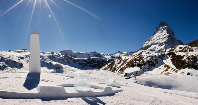 ニューヨークを拠点に活動するダニエルは、絵画や彫刻、インスタレーション、映像など、多岐に渡る力強い作品で知られ、特に「Connecting Time」シリーズや、象徴的な作品である「Hourglass(砂時計)」が代表的です。期間限定で公開された今回のインスタレーション「Light & Time」は、スイスアルプスで最も知名度の高いマッターホルンを望む、スイスの山岳リゾート地ツェルマットの雪景色の中に制作された日時計です。自然の要素を用いて、計時のルーツとランドアートにおけるクラフトマンシップを融合させています。クリスタルクオーツの形をしたオベリスクが落とす影を利用した、機能的な屋外計時のインスタレーションで、太陽の動きに合わせて中央のポインターが影を落とし、傾斜した雪の中に時間を示します。