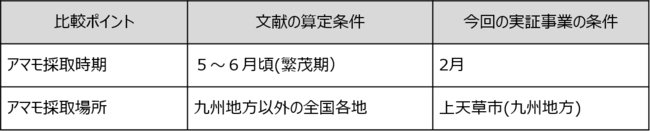 アマモの年間CO2吸収量を実測値から算定し、文献値から算定した場合と比較して、結果に差があるか検証しました。文献値と実測値で、使用するアマモには以下の差があります。