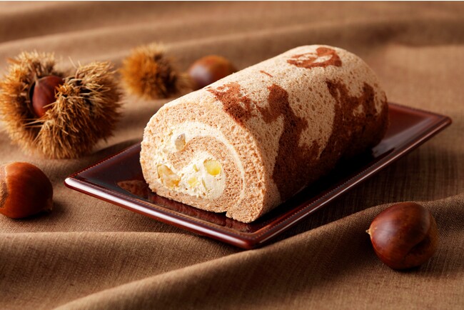 キャラメルとココアの2色の生地をマーブル状に焼き上げ、キャラメルクリームとマロングラッセ、栗甘露煮をやさしく巻きました。秋を感じる季節限定のロールケーキです。