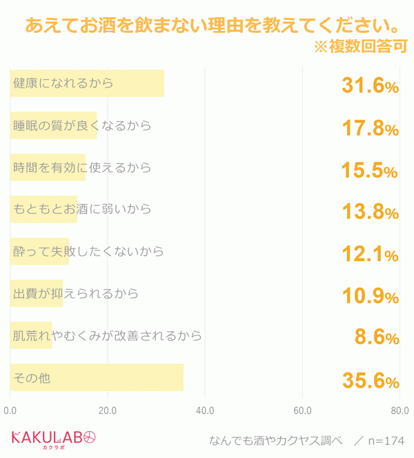 そこで、「あえてお酒を飲まない時がある人」にその理由を複数回答可で聞いてみたところ、「健康になれるから」が32%、次いで「睡眠の質が良くなるから」が18%、「時間を有効に使えるから」が16%と続きました。