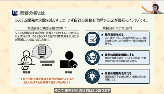 特に本講座では、kintoneの基本機能だけでなく、業務分析から解説しているため、業務の棚卸しや業務フロー図の作成方法についても説明しています。kintoneに限らず、他のノーコードツールの導入や独自のシステム開発を行う場合でも、役に立つコンテンツとなっています。