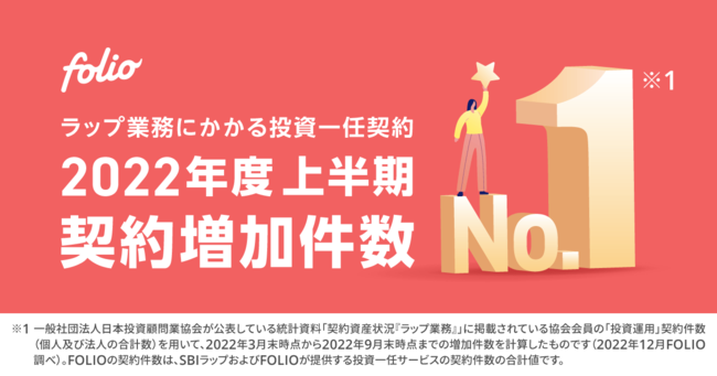 AI(人工知能)を活用したロボアドバイザー「FOLIO ROBO PRO(以下ROBO PRO)」および株式会社SBI証券(本社:東京都港区、代表取締役社長:高村正人、以下:SBI証券)と共同開発した「SBIラップ」を提供する株式会社FOLIO(本社:東京都千代田区、代表取締役CEO:甲斐 真一郎、以下:FOLIO)が、ラップ業務にかかる投資一任契約で、2022年度上半期において契約増加件数第1位(※1)となったことをお知らせします。